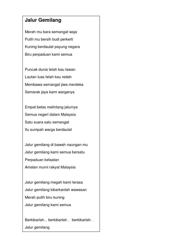 Jalur Gemilangdi bawah naunganmu Jalur Gemilangkami semua bersatu Perpaduan ketaatan Amalan murni rakyat Malaysia Jalur Gemilangmegah kami terasa Jalur Gemilangkibarkanlah wawasan Merah putih biru kuning Jalur semangat kami semua Merahmu bara semangat waja Putihmu bersih budi pekerti Kuning berdaulat payung negara. Lirik lagu jalur gemilang merahmu bara semangat waja putihmu bersih budi pekerti kuning berdaulat payung negara biru perpaduan kami semua puncak dunia telah kau tawan lautan luas telah kau redah membawa semangat jiwa merdeka semarak jaya kami warganya empat belas melintang jalurnya semua negeri dalam malaysia satu suara satu semangat itu sumpah. Jalur gemilang kibarkanlah wawasan.